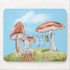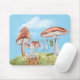 Cute gray mouse sitting on a tree stump with laundry hanging from two mushrooms