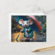 A little cheerful mouse is standing in the rain with a large umbrella. There are raindrops, puddles and colorful color flexes to be seen everywhere.