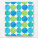 A vibrantly coloured Mousepad with a 'Blue Moons' abstract pattern in bright blues and neon green on a white background; from a handpainted paper collage design by Judy Adamson.