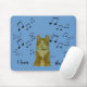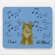 Orange striped cat with white face and chest is surrounded by multiple flying musical notes. Customize by changing the blue background to a color of your choice.