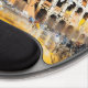 The plastic backing is nice and sturdy. The grippy pads underneath keep the mouse pad where I put it on my table. The pad the mouse sits on is cut well to fit the backing. The wrist pad is perfectly soft, supportive, and thick. I'm left-handed, and this mouse pad works just as well for me as it does for my right-handed friends. I'm the designer of HippieClecticHope products. I'm blown away by how well my intricate fractals turn out on the tangible items in the Zazzle Marketplace. This particular mouse pad ***appears*** like a 3D object... A mathematically-engineered rainbow black opal, inlaid under transparent fabric...