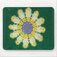 Crochet pattern of daisy in yellows, gray on hunter green background.