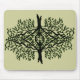 Tree with weeping branches/leaves. Graphic image in black with dark green tint. Image has been replicated and turned to give a kaleidoscope effect. Background is a grayish green.
