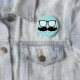 Moustache and glasses flair button on blue polka dot background is cute and trendy.