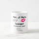 A personalized mug for a wedding anniversary with a trendy design - glamorous pink kissy lips and a masculine retro-looking moustache illustration. Retro looking words says Mr. and Mrs. and you can personalize with your name and years together.