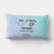 A personalized pillow for a wedding anniversary with a trendy design - glamorous pink kissy lips and a masculine retro-looking moustache illustration. retro looking words says Mr. and Mrs. and you can personalize with your name and years together. Set on a blue watercolor background.