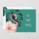An elegant pink flamingo wearing a hibiscus flower is set against a teal monstera leaf on a tropical blue-green background. The text on front of our change of address postcard reads: "We have moved" and can be personalized on the template, along with your new address info on back of the card. In addition to the postcard, you can find a flat card with envelope and return address labels in the same motif in our Florida Change of Address Collection.