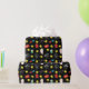 This design features a repeating pattern of movie themed items including: a bucket of buttered popcorn, a soda cup with straw, a red theater chair, que line ropes, film projector, directors clip board, an admit one ticket, 3-D glasses, and yellow stars. The background of the wrapping paper is shown as black. Click "Customize It" to select a different background color.