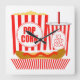 This square wall clock features a bag of popcorn, a hot dog and a cup of soda!