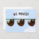 Creative moving announcement card featuring three cartoon sloths and funny line.