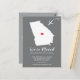 Modern moving announcement featuring the state of GEORGIA, with a red heart & airplane set on a gray background. The background color can be changed easily by clicking personalize and then click to customize further to view our color picker. From there you can also move the airplane & heart! Contact our shop if you require help or need another state.