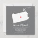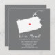 Modern moving announcement featuring the state of Pennsylvania with a red heart & airplane set on a gray background. The background color can be changed easily by clicking personalize and then click to customize further to view our color picker. From there you can also move the airplane & heart! Contact our shop if you require help or need another state.