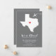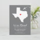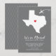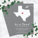 Modern moving announcement featuring the state of Texas with a red heart & airplane set on a gray background. The background color can be changed easily by clicking personalize and then click to customize further to view our color picker. From there you can also move the airplane & heart! Contact our shop if you require help or need another state.