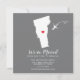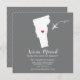 Modern moving announcement featuring the state of Vermont with a red heart & airplane set on a gray background. The background color can be changed easily by clicking personalize and then click to customize further to view our color picker. From there you can also move the airplane & heart! Contact our shop if you require help or need another state.