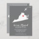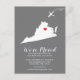 Modern moving announcement featuring the state of VIRGINIA with a red heart & airplane set on a gray background. The background color can be changed easily by clicking personalize and then click to customize further to view our color picker. From there you can also move the airplane & heart! Contact our shop if you require help or need another state.