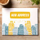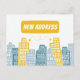 Cartoon style pattern with yellow and blue retro buildings for a very exclusive new address announcement.
