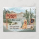 Moving Cute Golden Retriever Dog New Address Pines Announcement Postcard set in your new neck of the woods is the perfect way to let your friends and family know where you are. This woodland scene features a welcoming scene with a beautiful blue sky, mountains, loads of pine trees, and a wooden sign with your familly and dog's name. This Cute Golden Retriever Dog retriever has it all figured out. He's got his red buffalo check bandana and a new side hustle. He's selling sticks for other dogs to play with and a friendly squirrel to keep him company. The back of the post card features a woodland background for your address and email and an invitation to come visit- and bring treats. This watercolor hand painted art sets this design apart. ALL of the text is editable, even the dog's comment, so make it your own with your name and new address and comments. You will find this woodland moving announcement with a friendly Cute Golden Retriever along with loads of other breeds in our collection WOODLAND PINE MOVING ANNOUNCEMENTS WITH DOGS in our store. Designed by our stationary artist Nancy Lambert whose dogs love to chase squirrels.