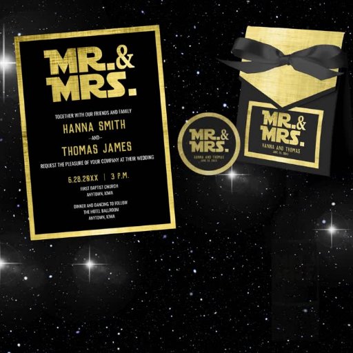 Introducing our Sci-Fi Themed Wedding Sticker, a perfect blend of cosmic elegance and futuristic charm for your special day. This exquisite round sticker features a mesmerizing space galaxy black background, adorned with a brushed gold look that creates a stunning contrast. The bold "MR. & MRS." text takes center stage, crafted in a sleek, modern font that exudes sophistication and a touch of sci-fi allure.