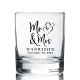 Custom wedding whiskey glass featuring "Mr & Mrs" in a large elegant script and an illustration of two hearts joined together. Add your name and wedding date.