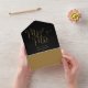 This all-in-one minimalist wedding invitation features elegant gold typography on a black background. The invitation includes a perforated RSVP card with your wedding website QR code. Designed by Thisisnotme©