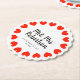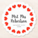 Mr and Mrs wedding coasters with red hearts . Elegant paper coasters in round or scallop shape. Classy design with stylish brush script typography and custom surname. Trendy party accessories and table decorations for married couples and newly weds. Use for chic bridal shower, luxury wedding, fancy anniversary celebration etc. Change quantity to get the cheapest bulk price. Romantic love icon design with date of marriage.