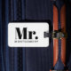 Travel in style with this masculine luggage tag for grooms and newlyweds. This design features a background of faux black leather with "Mr." and your last name in a modern light gray script typography. The back of the bag tag has your contact details for you to personalize in light gray on a black faux leather background. Designed by artist ©Susan Coffey.