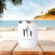 A sleek Mr thermal wine tumbler featuring bold modern black brush script with a custom last name monogram beneath. The clean white tumbler with striking black typography makes a stylish gift for the groom. Perfect for wedding day getting-ready moments, honeymoon travel, or everyday use as a newlywed keepsake. Pairs beautifully with the matching Mrs tumbler. All text is fully customizable.