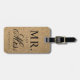 A modern, fun luggage tag featuring large Mr. and Mrs. text and family name below in a mix of gender specific fonts. Perfect for newly weds and honeymooners.
