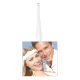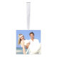 This modern christmas ornament design features a full bleed photo on each of the back, right, left and bottom side. The top side features a minimalist circle text with your wedding details.