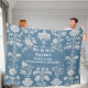 Celebrate the beginning of 'forever together' with vintage elegance through the Mr & Mrs Newly Wed Dusty Blue Flora French Country Fleece Blanket. Designed for couples who appreciate timeless romance and classic cottagecore decor, this beautifully detailed fleece blanket blends dusty blue botanical artistry with French country artistry, creating a meaningful keepsake that honors newlywed bliss. Inspired by antique French textiles and countryside estates of Provence, the design features delicate distressed white florals arranged in a graceful composition against a dusty blue backdrop. The text is customizable, add your own words.