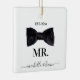 An elegant black and white wedding themed design perfect for newlyweds or the bridal party. The ornament is designed in black and white with a stylish black bow tie for the "Mr." and a beautiful sparkling diamond for the "Mrs." The established date is located on top which can be customized to your wedding date or a memorable date in your lives. An elegant script font is used for the bride's and groom's names located to the bottom. Customize the text and make it your own.