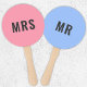 Play a fun game of Mr or Mrs? with these pastel pink and blue game paddles! Endless fun for wedding parties, bridal showers, engagement parties, bachelorette, bachelor parties or a fun way to get the in-laws to know you better! Ask a friend to write some embarrassing stories, silly secrets and everyday facts about the couple and have the guests figure out if its the Mr or Mrs! At your wedding reception, you can include a fan at each place setting or pass them out to your guests when you’re ready to play. To start the game, sit with your spouse in the center of the dance floor, back to back, each with a fan in hand. Designate a DJ or loved one to MC the game. The rules are simple. The MC will call out questions about the newlyweds. You and your guests will then answer using the fan paddles. If everyone thinks you’re more likely to lose your keys, they’ll hold up Mr or Mrs. If your partner is the perceived better dancer, your guests will flip the fan. Everyone will roll in laughter when you both disagree on who is messier! Here are some question ideas: Who is the better cook?, Who was cooler in high school?, Who is more likely to be late to work?, Who is more creative?, Who wants more kids?, Who snores most?, Who is most likely to get a speeding ticket? or Who has the crazier family? Make it even more special by including questions specific to the couple. The possibilities are endless!