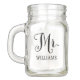 Personalized wedding mason jar design features Mr. in black script with custom text for the groom's last name. Two-sided design. Shop our store for the coordinating Mrs. mason jar design.