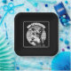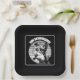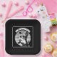 Black and white portrait of a mini schnauzer with glasses on a sunset background in vintage style. The perfect gift for schnauzer lovers.