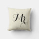 Mr. Pillow in black on light beige background color, with striped black and light beige back. Part of a Mr. and Mrs. pair. Customizable. Background color, text, and text color can be changed.