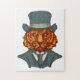 A tiger wearing a teal suit and top hat is depicted against a muted background, giving an elegant and whimsical appearance. The animal's serious expression is emphasized by the formal attire.