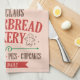 Here's a cute kitchen towel that kids and adults alike will find fun for the Holiday Season! The top features a caricature of Mrs. Santa Claus in her red cap decorated with a holly spring. Below her image is the stylized text in brown and red that says "Mrs. Claus GINGERBREAD BAKERY", and below that "Cakes Cookies Pies Cupcakes" The text "Fresh Daily" is inside a red banner. Everything is placed on a light tan background.