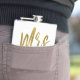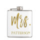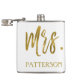 Mrs. Last Name White Flask with Gold Foil Typography. The Mrs. Last Name flask make a perfect bridal shower or honeymoon gift for the bride and matches the Mr. Silver flask for the husband.