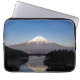 Majestic Mt Fuji reflected in Lake Tanuki and framed by the river banks at nightfall.