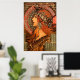 A reproduction of a 19th C. Art Nouveau poster by Alfons Mucha featuring a graceful figure of a woman, an advertisement for a maker of soap.