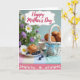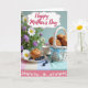 On the front of the card a golden muffin sits on a white plate, flanked by deep blue berries and a white daisy with a sunny yellow center, like a small treat set out with affectionate care ❤️. Nearby, a white woven basket tied with a sky-blue ribbon is filled with warm pastries, suggesting someone thoughtfully prepared a shared brunch moment. Everything rests on a softly striped cloth in pink, cream, and pale blue, adding a gentle, cozy backdrop. Diffused light brings out the muffin’s fluffy top and the berries’ smooth sheen, giving the scene a quiet, close-at-hand intimacy. In the background, a softly blurred arrangement of white daisies and purple florets sits against a calm teal wall, with a classic teacup tucked in to hint at lingering conversation 🌼. Across the top, an ornate frame holds the words “Happy Mother’s Day” in bold red lettering, centered and easy to read. Along the bottom edge, a bright pink band is trimmed with an intricate white floral garland that borders the design. The daisies and purple blossoms fade gently into the teal background behind the basket and teacup.