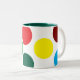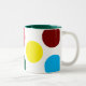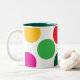This mug features large, vibrant polka dots in bold colors—yellow, red, green, and pink—on a clean white background. The inner rim is a deep teal, adding a modern contrast. The playful pattern gives it a cheerful, youthful vibe, perfect for brightening up any morning routine.