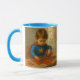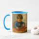 Mug with a young boy dressed as a superhero with a red cape makes a new suit.