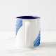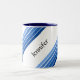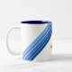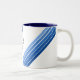 Blue lines in varying five shades of blue. Dark to light, bottom to top. Two Sets of stripes are placed diagonally from top to bottom of mug. Personalize with name in center.