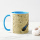Dragonfly sitting on the sand, a shadow is visible beneath the body. This insect, of the order Odonata, has transparent wings and large eyes. The bright blue of the body is picked up in the color the mug's rim and handle. Great gift for the entomologist in your life.