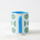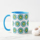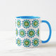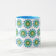 Mandala image is tiled around the mug. Single mandala has outer ring of diamond shapes in two shades of blue. Next ring towards the center is ovals of green with red dots. In very center is yellow circle.