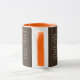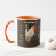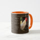 This two tone mug is shown in espresso brown with orange interior and handle with photo of a Rhode Island White chicken rooster on both sides of mug along with