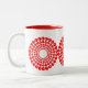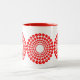 Red beads threaded on a thin line, form a circle. The circle is replicated 4 more times in increasingly smaller circles going to the center to creates an optical illusion of a tunnel effect. Three patterns placed around mug.