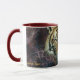 A ringer beverage mug showing a portrait image of a magnificent male Malayan Tiger (Panthera tigris jacksoni). This beautiful orange and black-striped feline is standing in bright sunlight and is digitally superimposed against fantastical background of celestial and fractal imagery. The cat is gazing intently off to the viewers right.