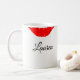 Ceramic coffee mug shown with a lips print and a custom name sample.